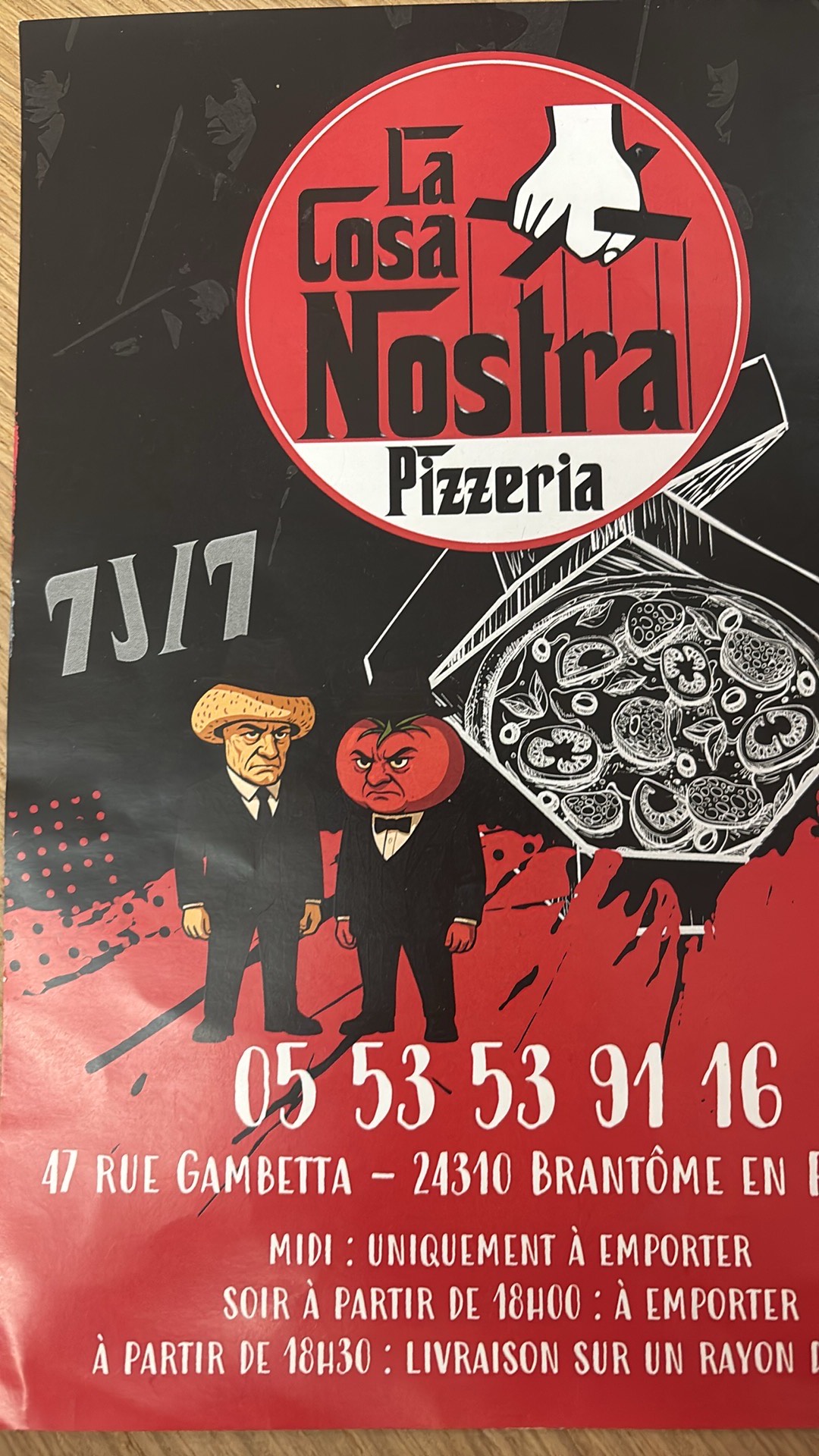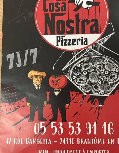 Située au cœur de Brantôme, La Cosa Nostra vous invite à découvrir l’authenticité de la cuisine italienne. Spécialistes de la pizza, nous sélectionnons des ingrédients 100% italiens pour vous offrir une expérience gustative unique. Que vous soyez à la recherche d’une pizza savoureuse à emporter ou préfériez une livraison rapide, nous mettons un point d’honneur à vous offrir des produits frais et de qualité.